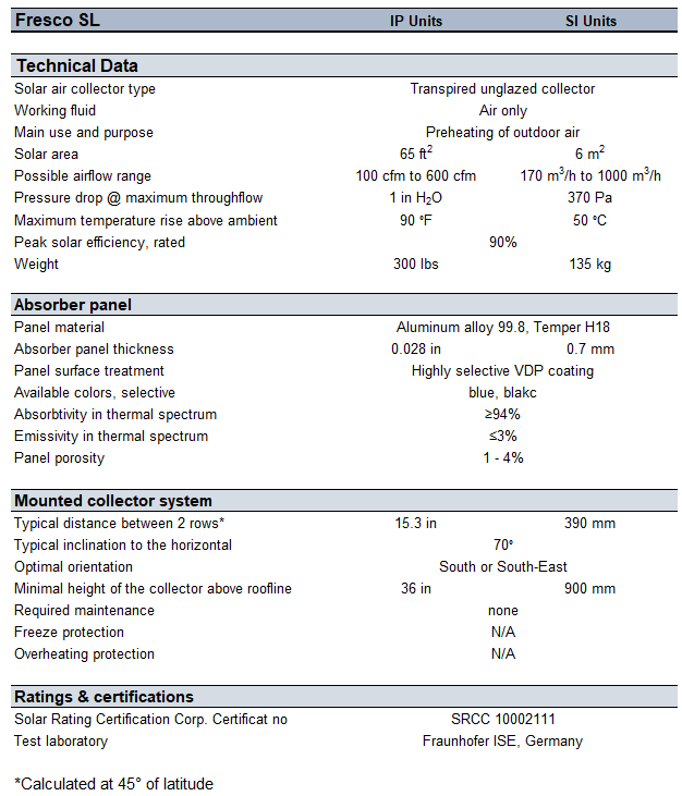 Because it is mounted on spacious flat roofs, the Fresco’s major advantage over wall installations is that it can always be designed to face due South, and inclined at an optimal inclination of 70°, to maximize the solar warm air output during the cold season.